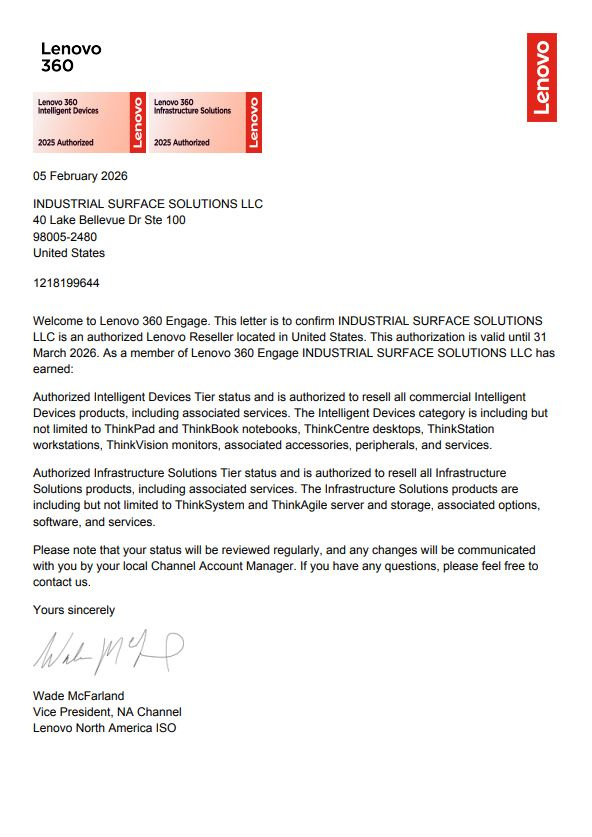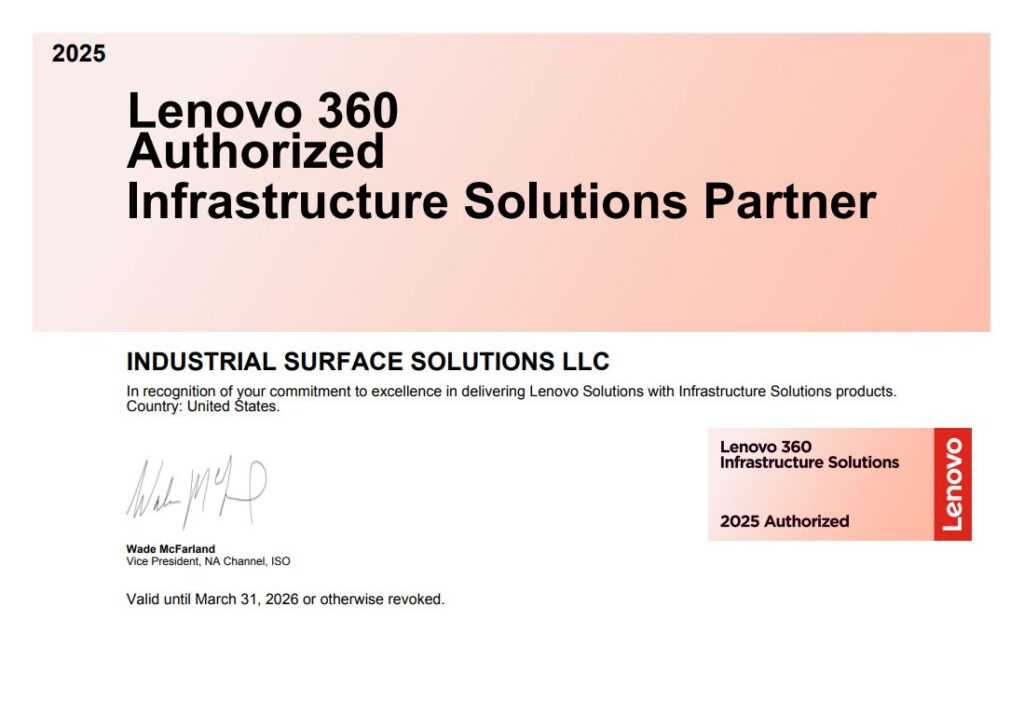 As a Lenovo 360 Authorized Partner, INDUSTRIAL SURFACE SOLUTIONS LLC provides vendor-authorized infrastructure quotes across centralized, distributed, and edge environments.