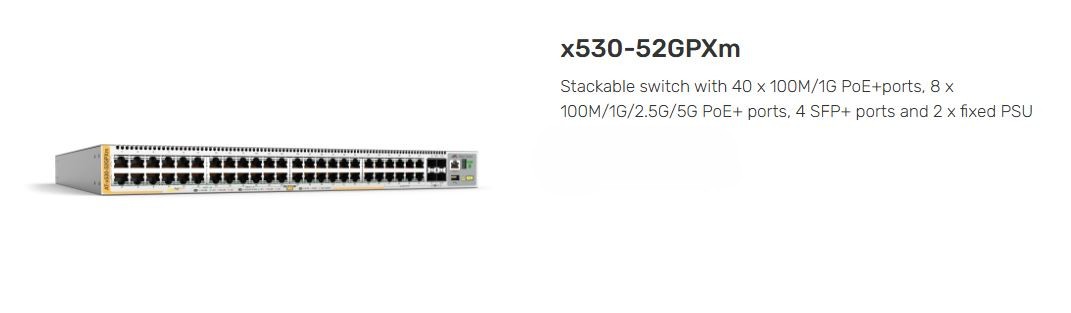 The Allied Telesis x530 Series of stackable Multi-Gigabit Layer 3 switches feature high capacity, resiliency and easy management, making them the ideal choice for demanding distribution and high-speed connectivity applications.