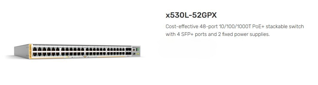 The Allied Telesis x530L Series stackable Layer 3 switches feature high capacity, resiliency and easy management. With both Multi-Gigabit and high port density models, plus Power over Ethernet, they are the ideal choice for network access applications.