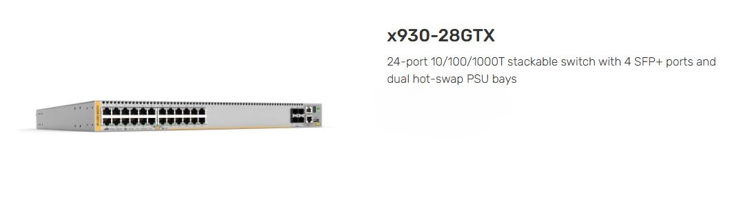 TAA 24-Port Gigabit Copper, 4 SFP+ slots, L3+ Per-Flow QoS IPv4/IPv6 Switch. Internal Redundant Modular PSU slots and Rear QSFP Expansion Module slot. OS = AlliedwarePlus, Federal Version