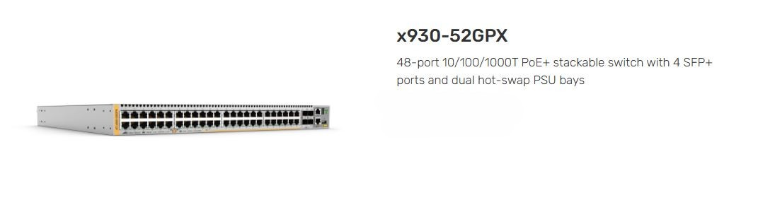 48 Gigabit ports with four 10 Gigabit uplinks; Dual hot-swap power supplies; Power over Ethernet provides the full 30 watts of PoE+ on all ports; Long-distance stacking of up to 8 units supports distributed environments